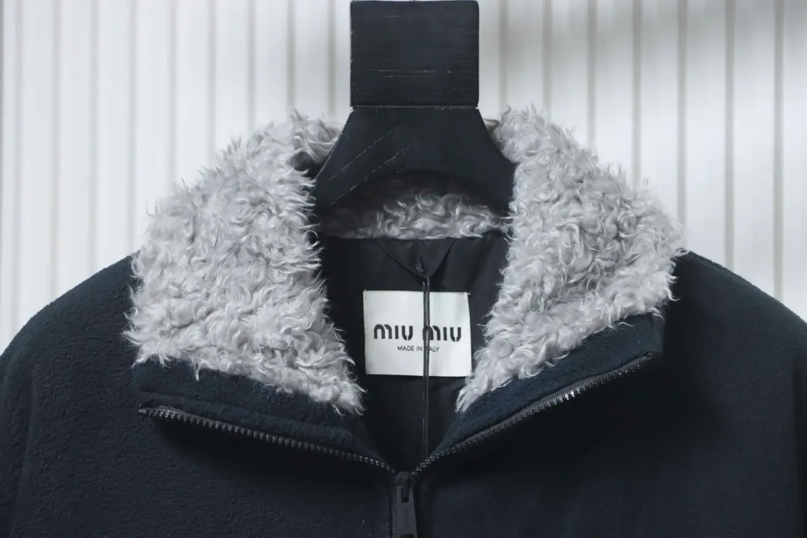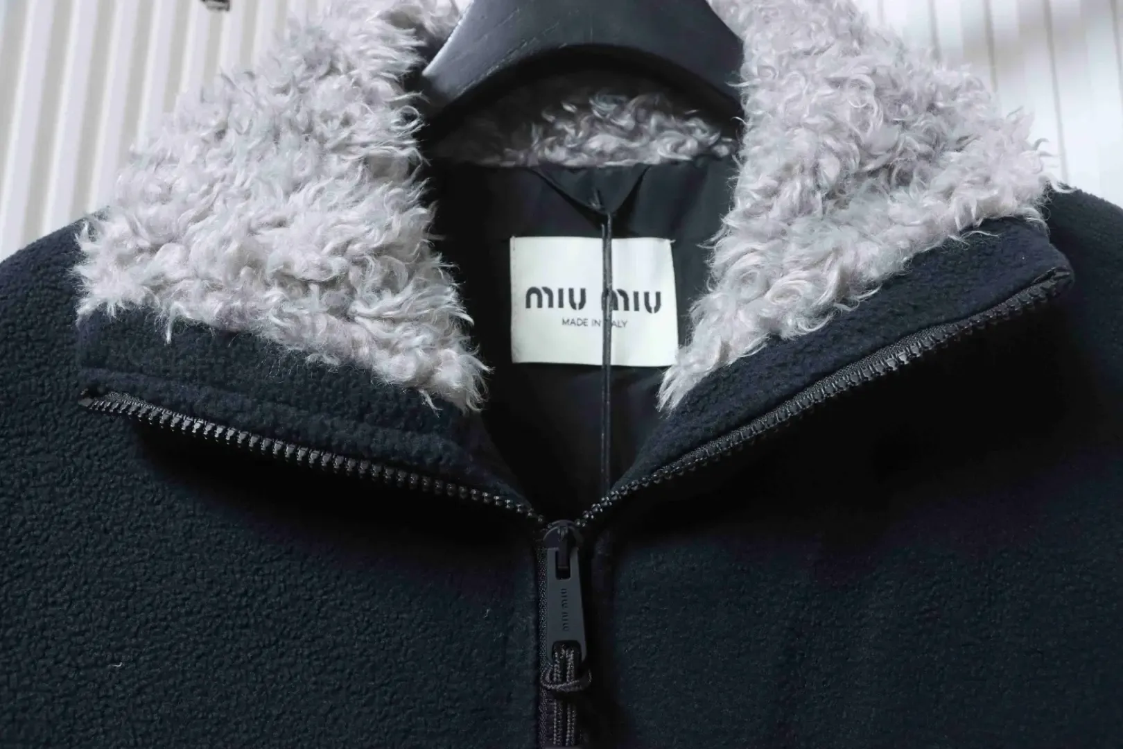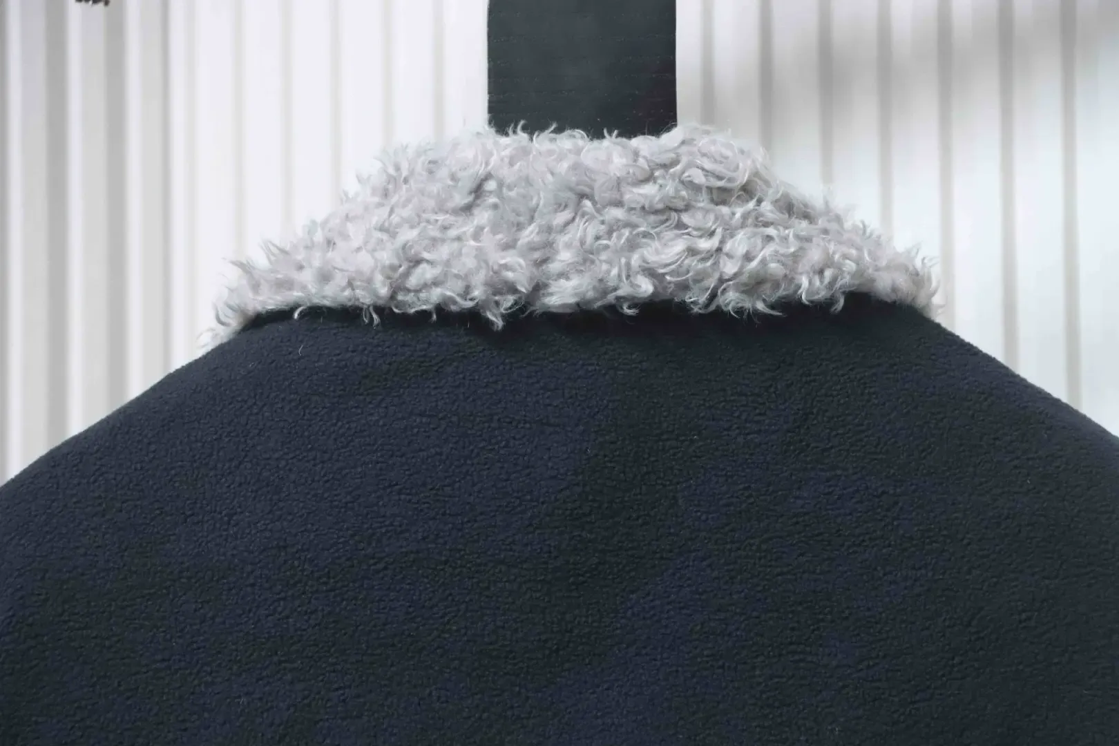 • Custom-dyed navy blue fleece; custom-made collar in grey lamb’s wool fabric.