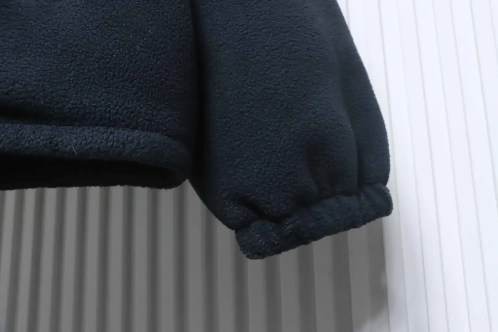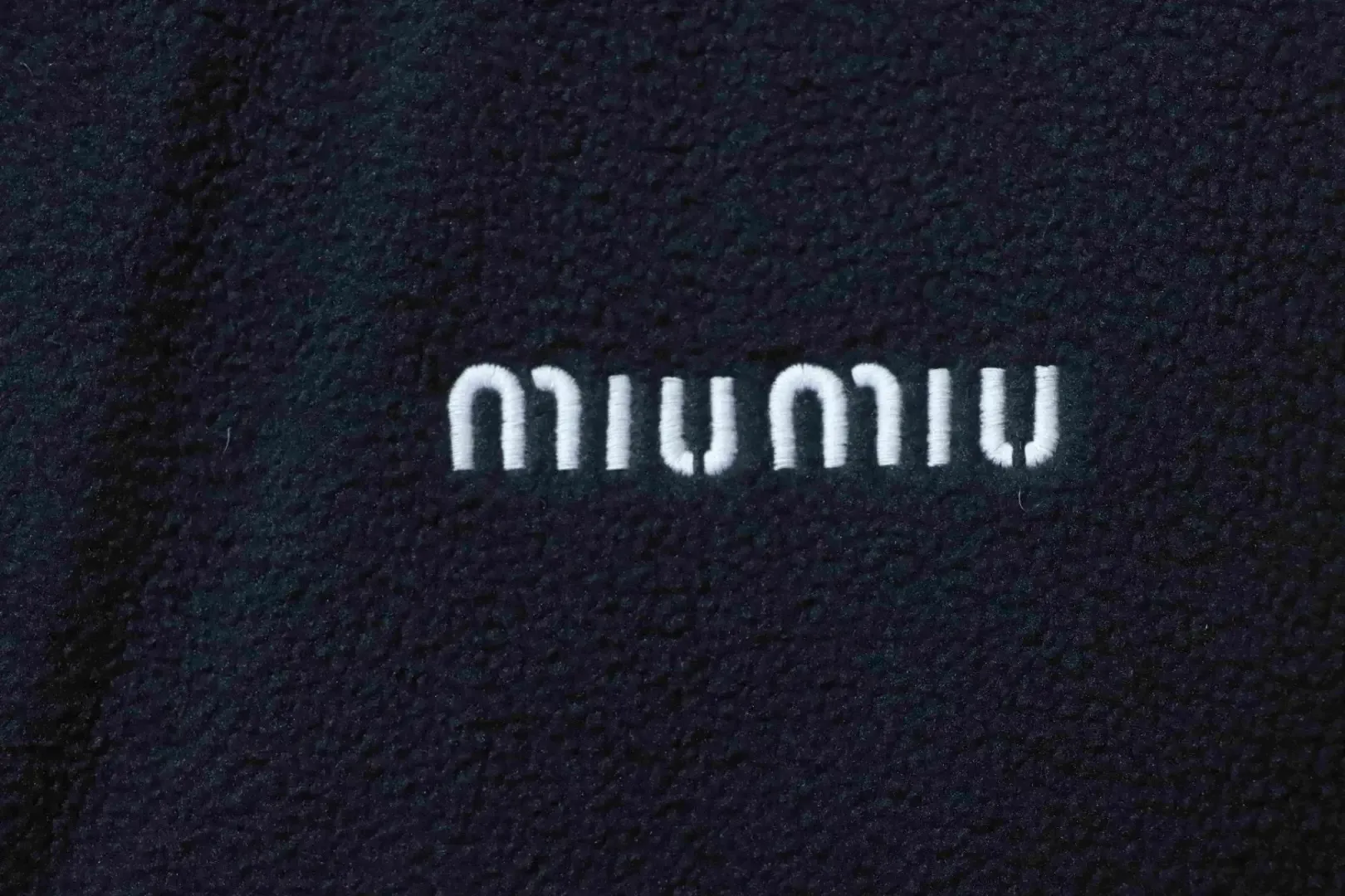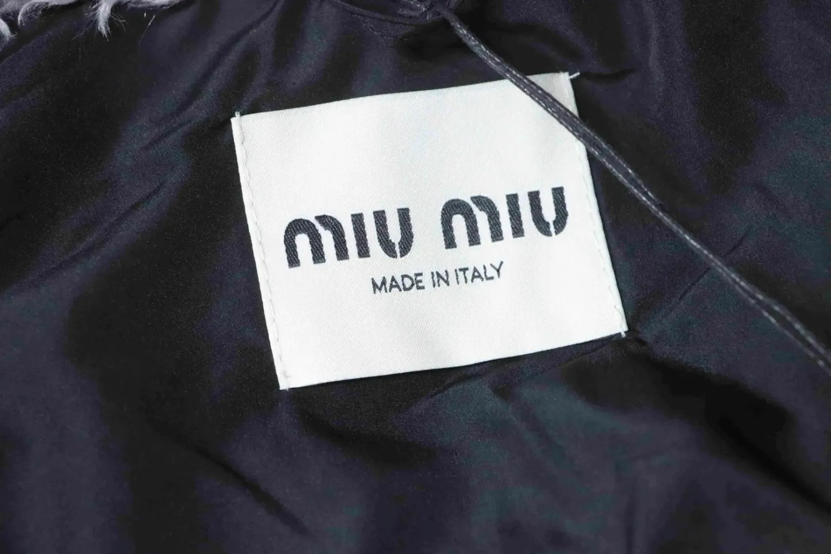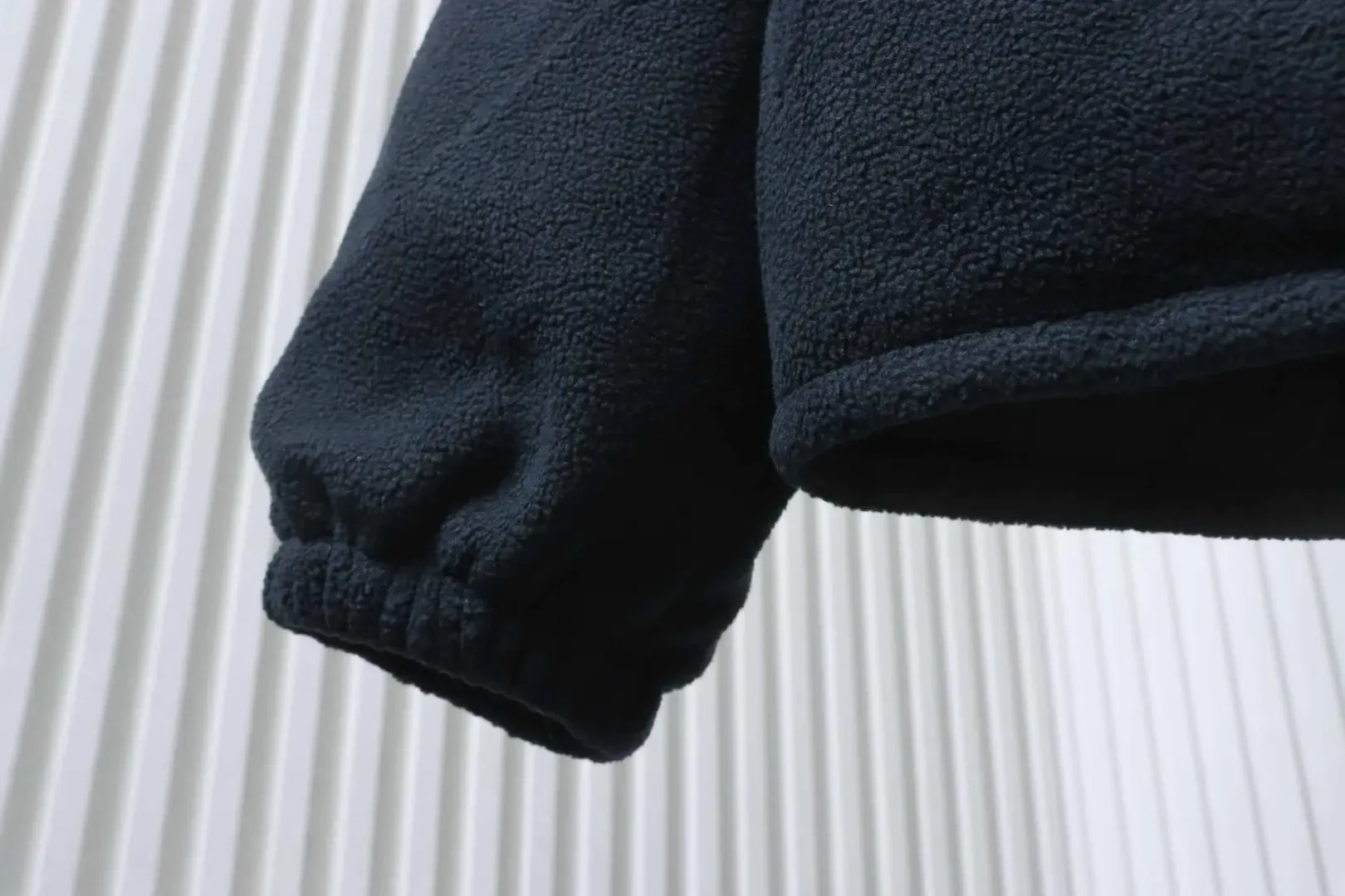 • Custom-dyed navy blue fleece; custom-made collar in grey lamb’s wool fabric.