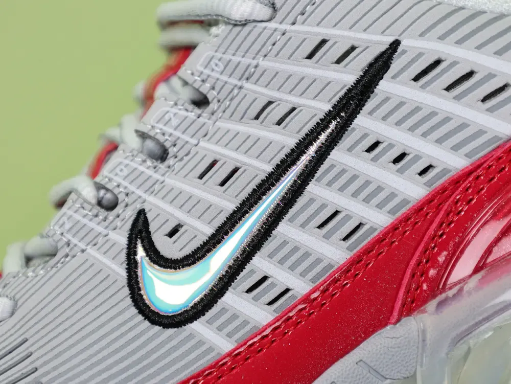 The shoe features a predominantly gray and white color scheme, accented by bright red details that create a strong visual hierarchy. Red lines run across the entire shoe, increasing its recognition value and giving the wearer a dynamic look.