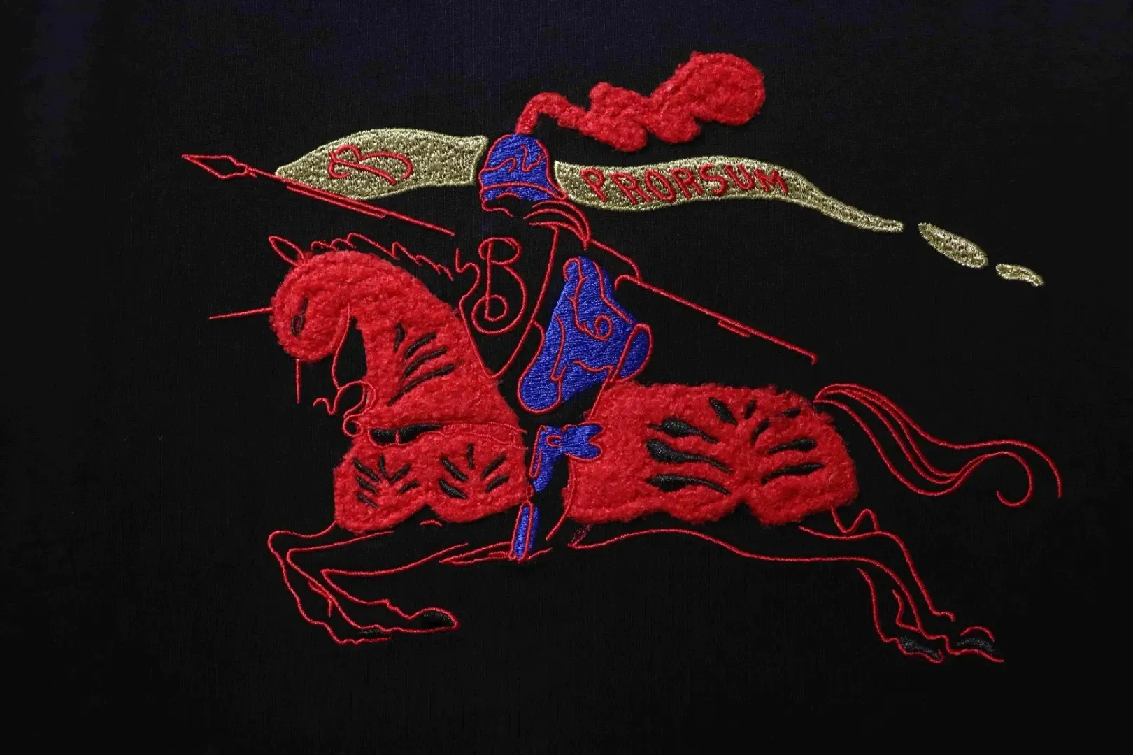 • The embroidered equestrian logo of the new season, combined with the richly textured metallic threads, forms the centerpiece of the design.