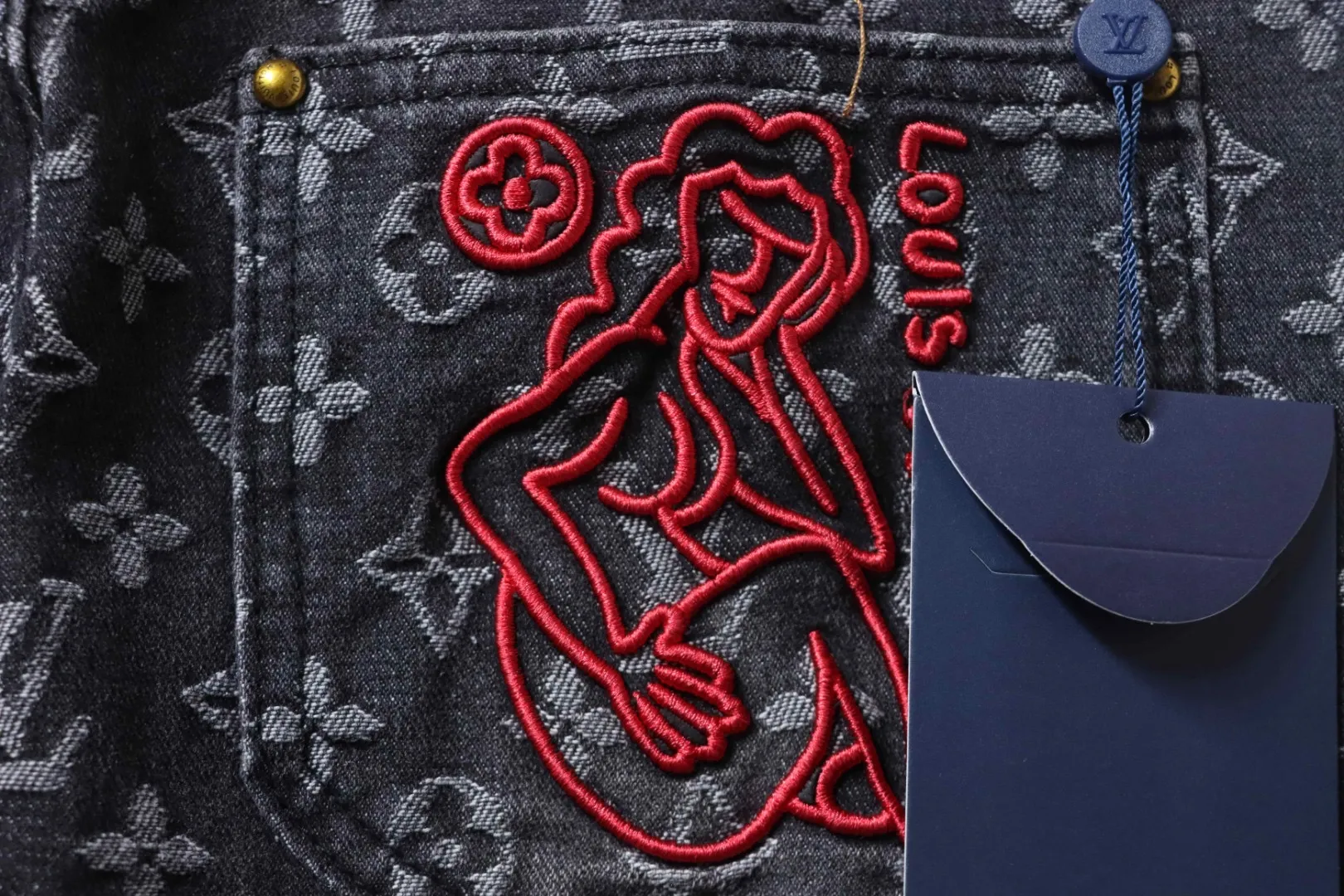 - Back details include embroidery on one pocket.