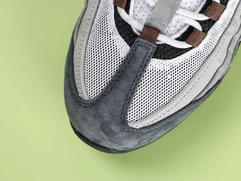 The shoe retains the iconic layered structure of the Air Max 95, creating a strong 3D effect through multiple layers of mesh and leather. The soft gray nuances of the 110 Grey give the shoe depth and dimension.
