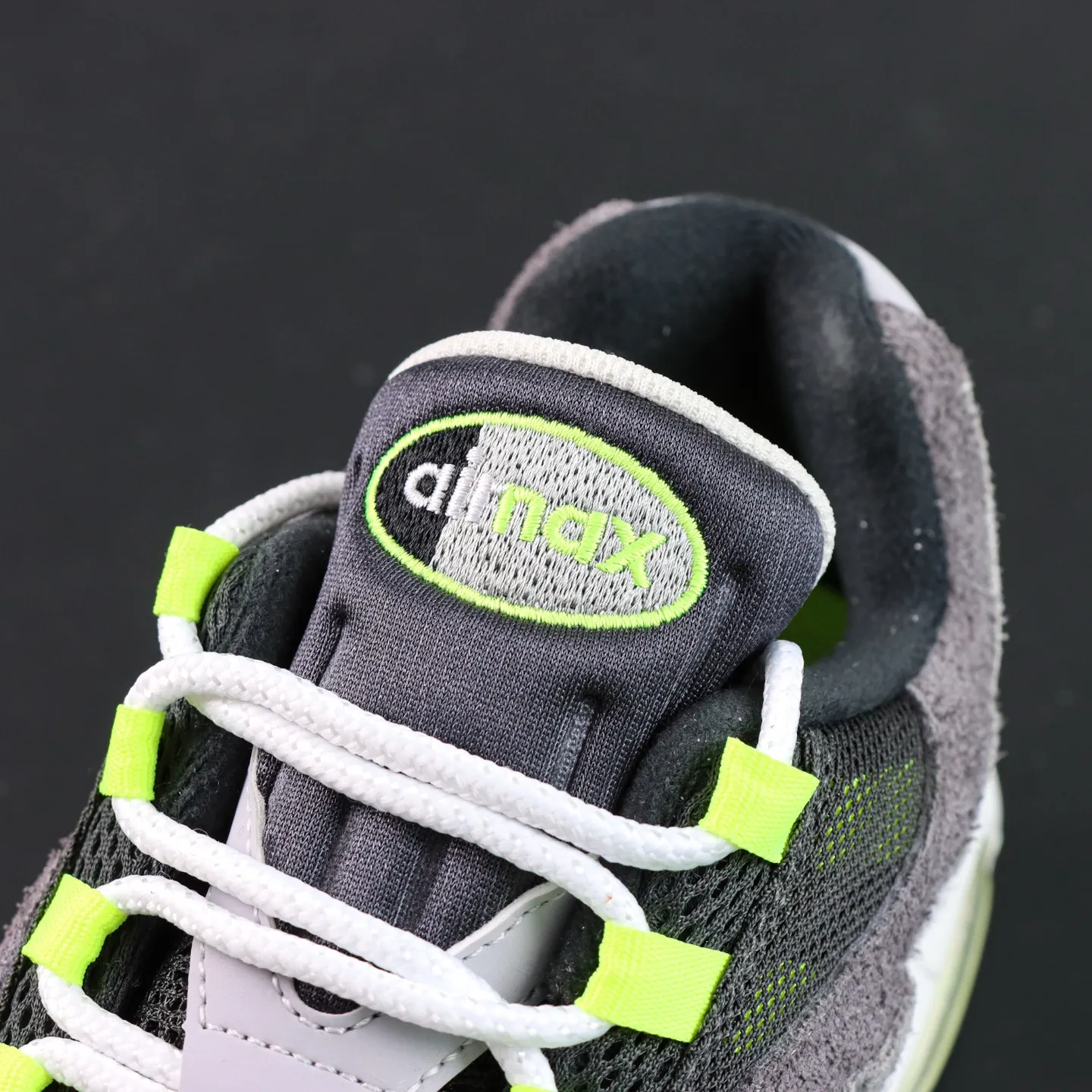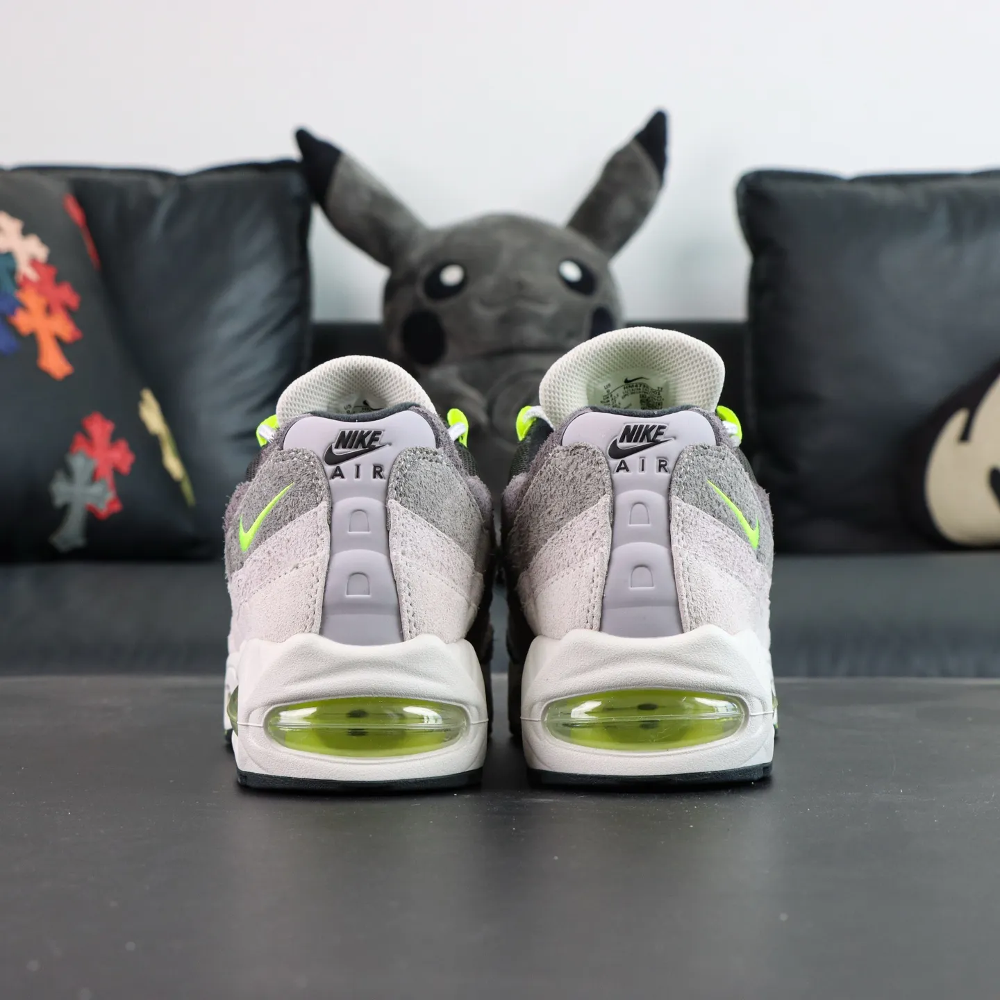 The Air Max 95 originated from an idea by designer Sergio Lozano. Its design is inspired by the human body. The midsole, whose shape is modeled after the human spine, forms the heart of the design. Nylon eyelets symbolize ribs, while multi-layered inserts and mesh represent muscle fibers and tissue. The Air Max 95 features two independent, blow-molded Air-Sole units and is the first shoe with visible cushioning in the forefoot. The Swoosh logo is located on the heel as a distinctive detail.