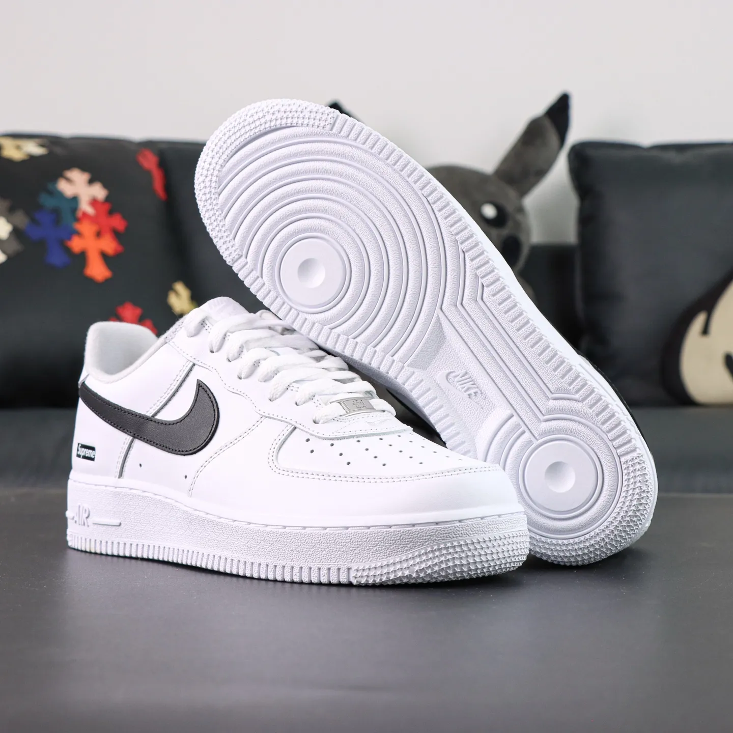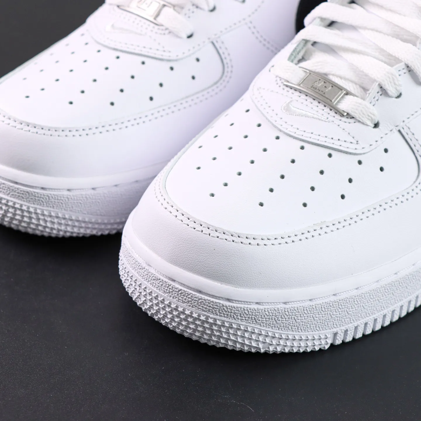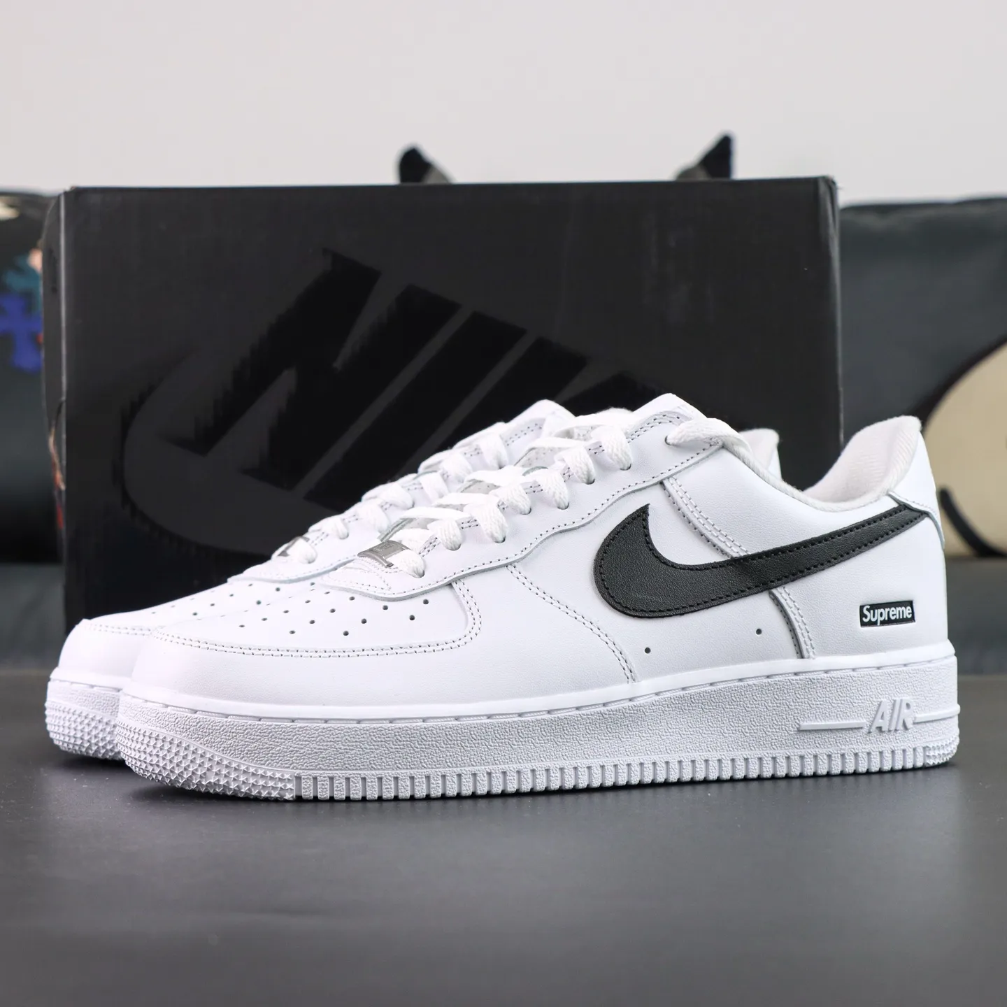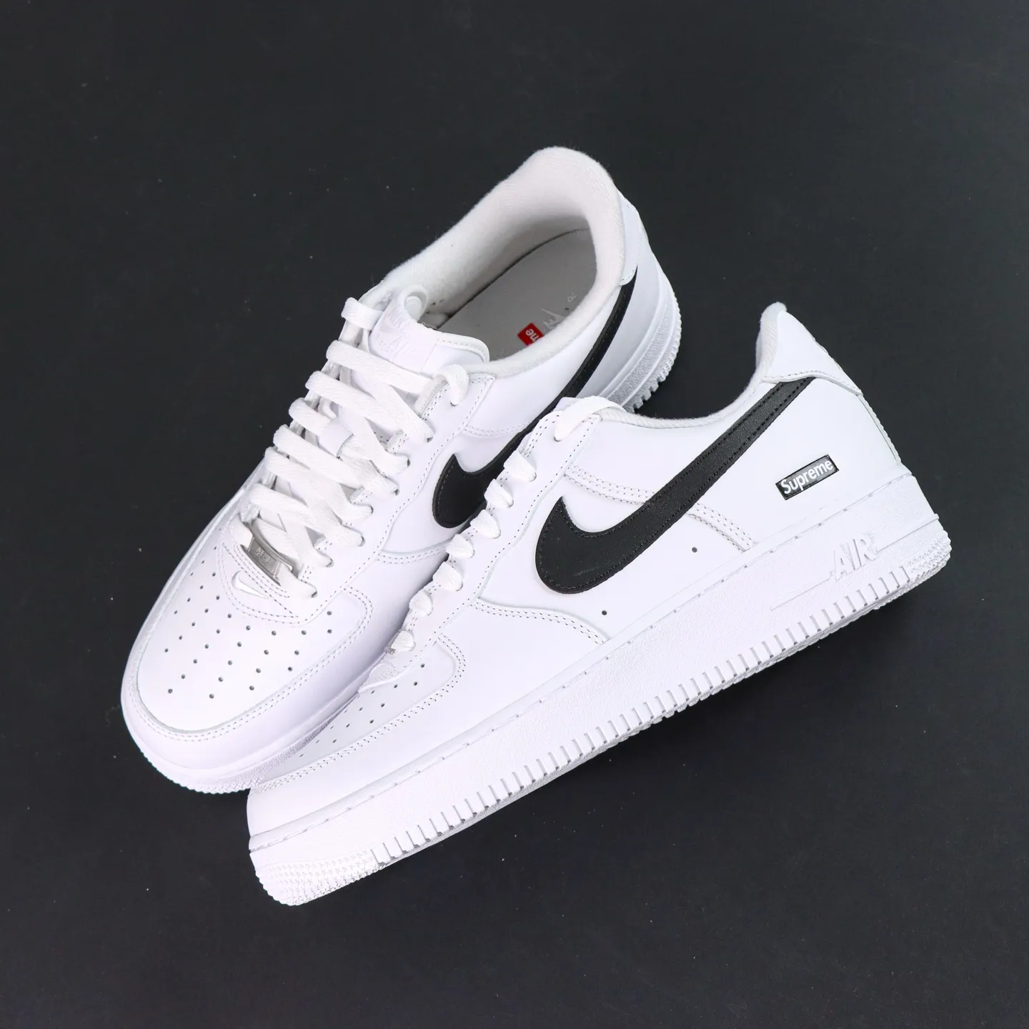 - The all-white color scheme gives the shoe a subtle yet luxurious look. The high-quality leather upper with a glossy finish makes it suitable for everyday wear while ensuring a strong statement on the street. The classic Air Force 1 silhouette and design, combined with the red embroidered Sup.1rem1e logo on the side, create a strong visual accent against the minimalist white base, striking the perfect balance between fashion and street style.