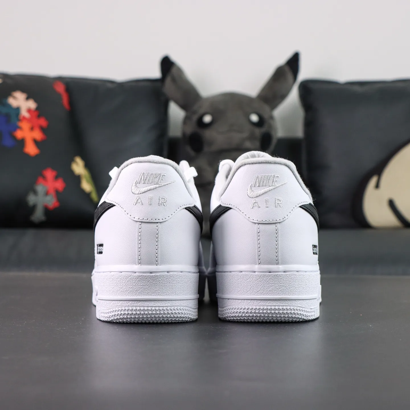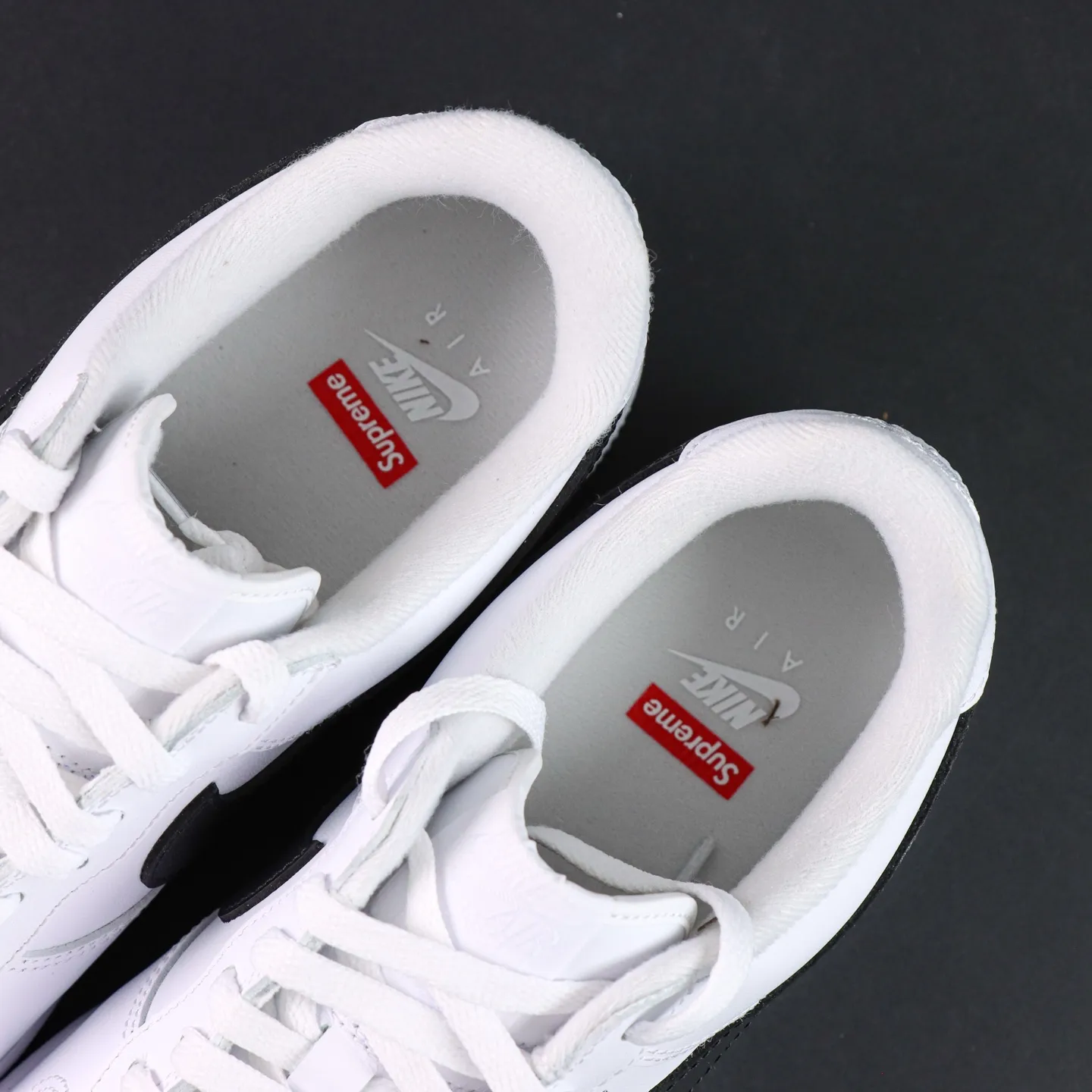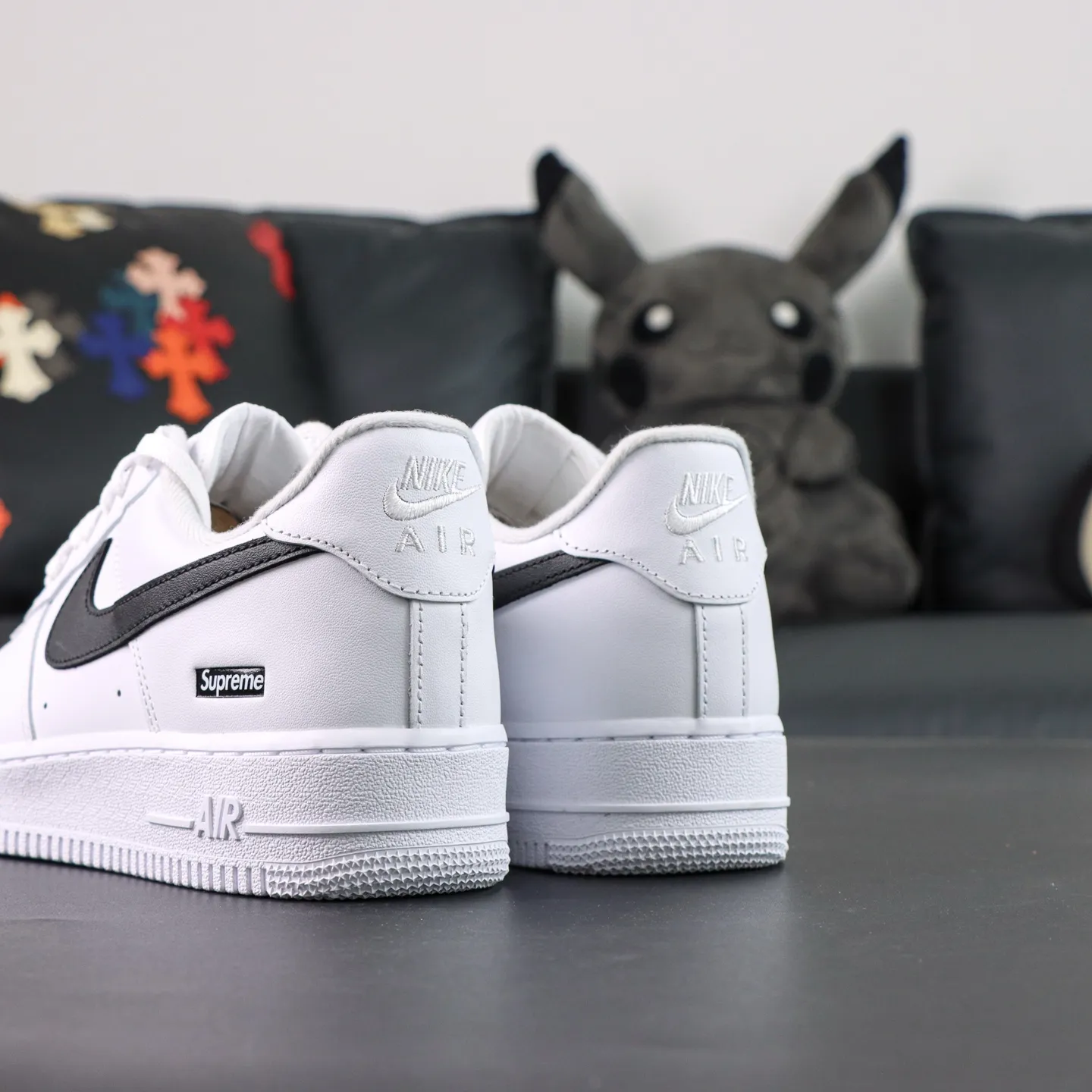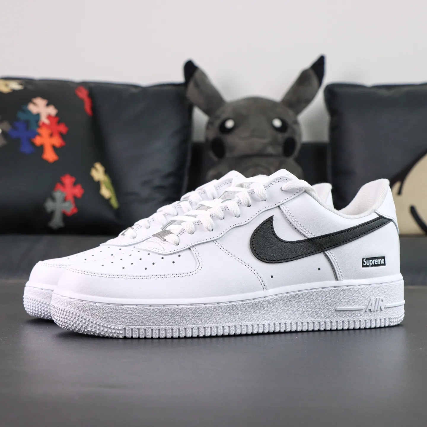 - The all-white color scheme gives the shoe a subtle yet luxurious look. The high-quality leather upper with a glossy finish makes it suitable for everyday wear while ensuring a strong statement on the street. The classic Air Force 1 silhouette and design, combined with the red embroidered Sup.1rem1e logo on the side, create a strong visual accent against the minimalist white base, striking the perfect balance between fashion and street style.