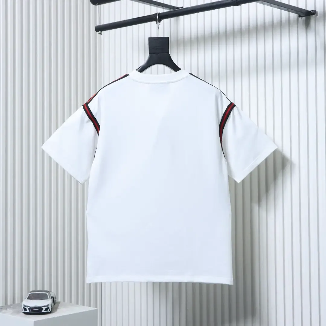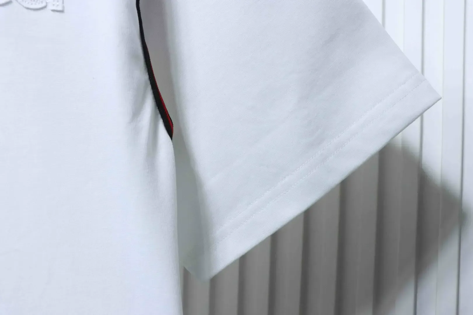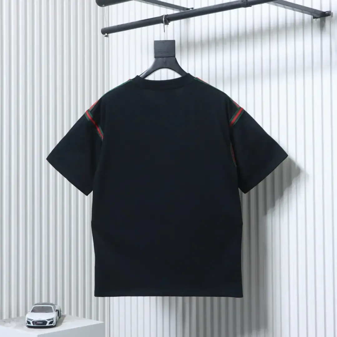Short-sleeved T-shirt with a red and green embroidered logo in a bow shape on the shoulders and sleeves. Short-sleeved T-shirt with a red and green embroidered logo in a bow shape on the shoulders and sleeves.