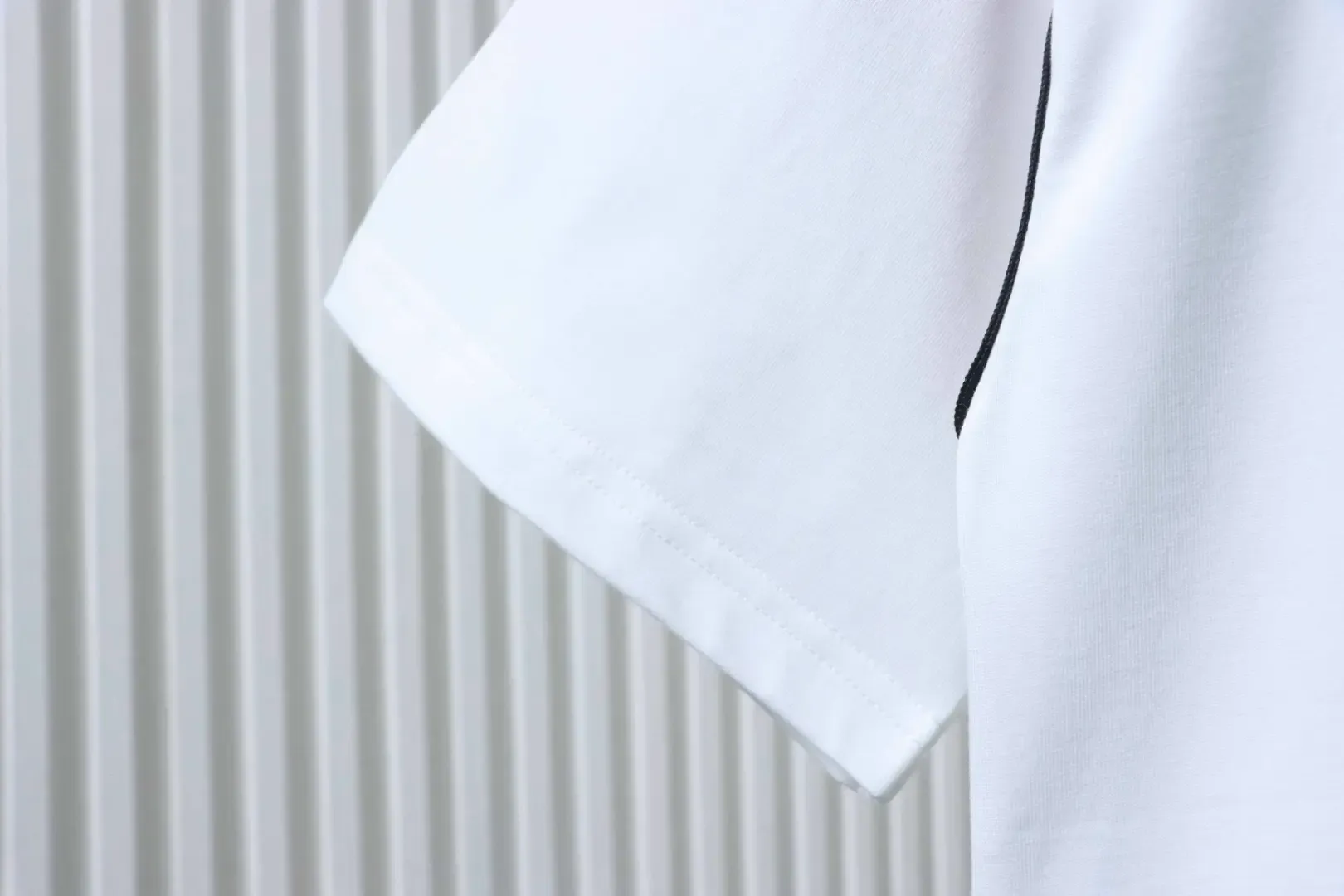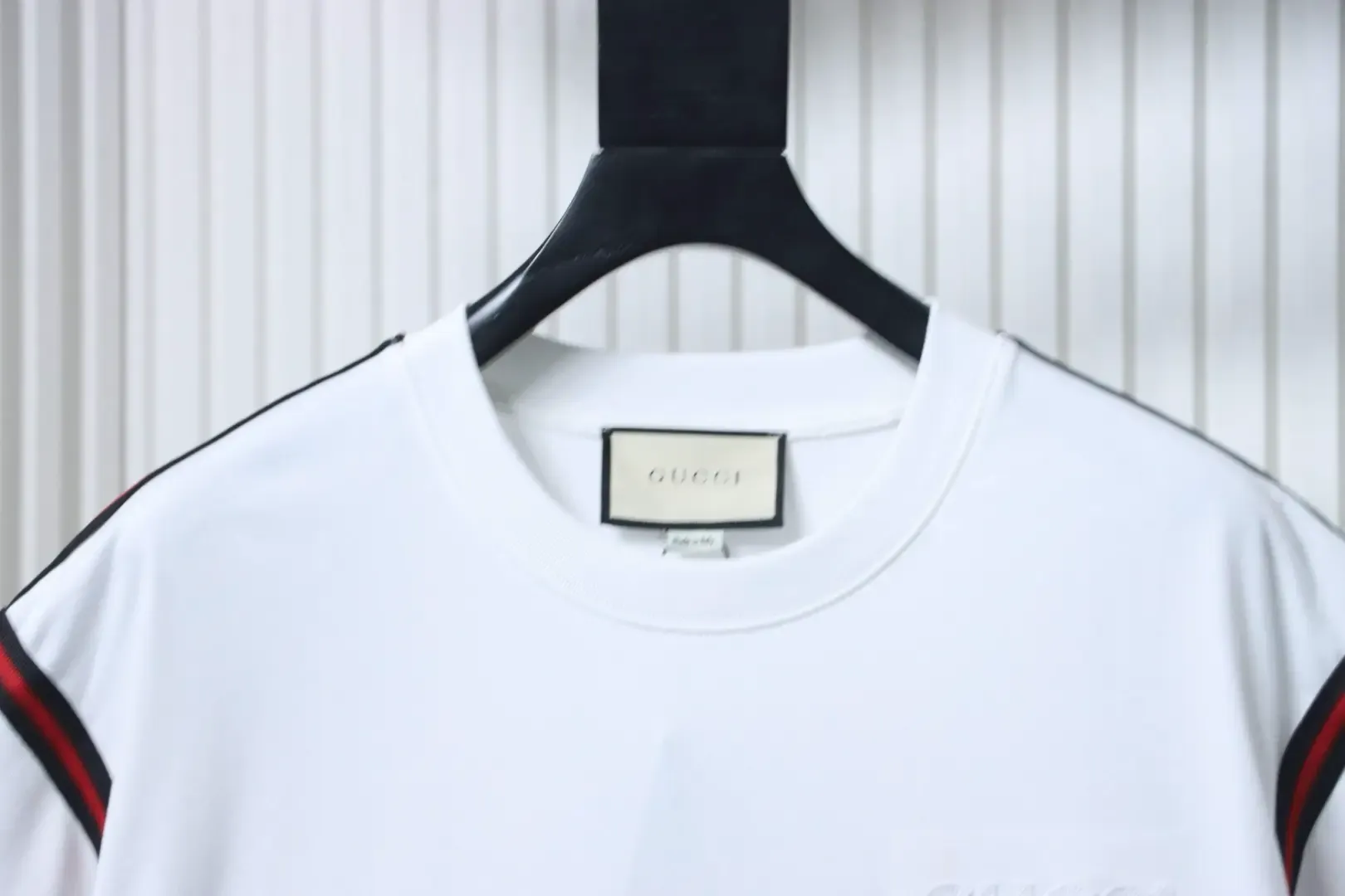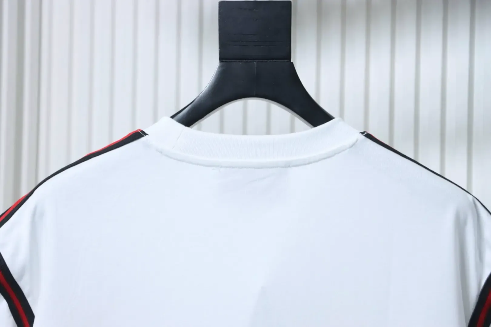 Short-sleeved T-shirt with a red and green embroidered logo in a bow shape on the shoulders and sleeves. Short-sleeved T-shirt with a red and green embroidered logo in a bow shape on the shoulders and sleeves.
