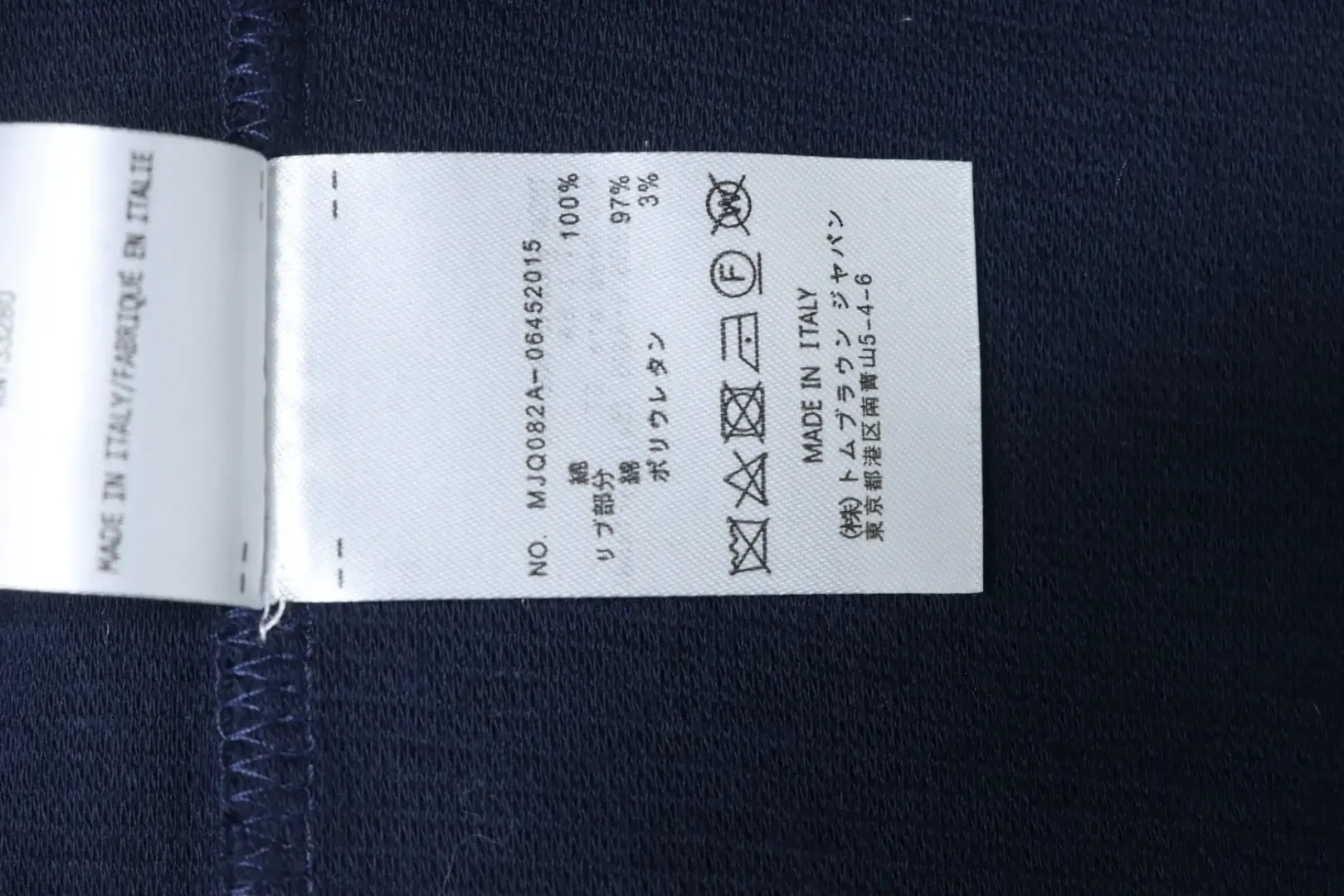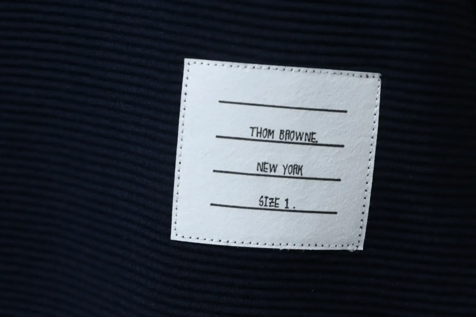 - The classic four-stripe design on the left sleeve cuff is an unmistakable Thom Browne trademark. The four parallel white lines are a signature design element and underscore the garment’s recognition value and style.