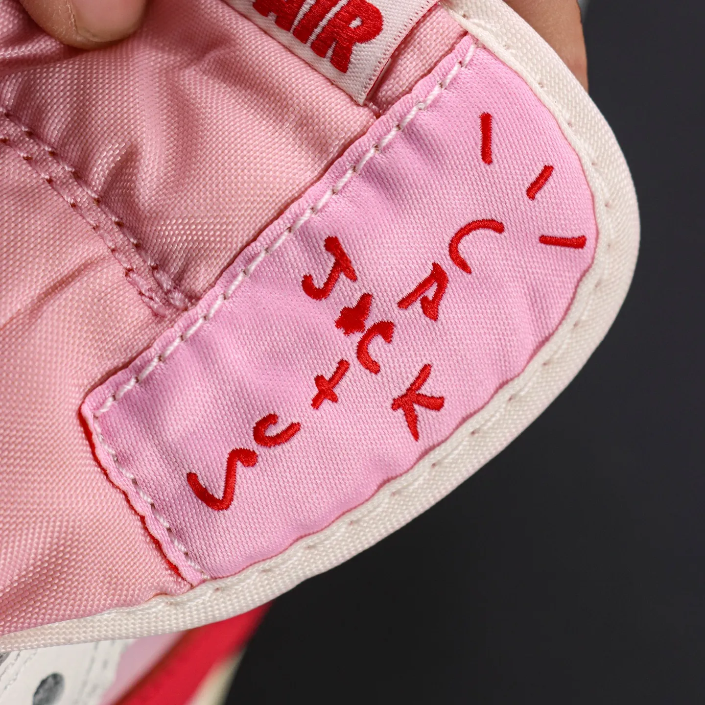 • Travis Scott’s signature inverted Nike Swoosh is prominently displayed on the side, creating a striking contrast to the pink upper.