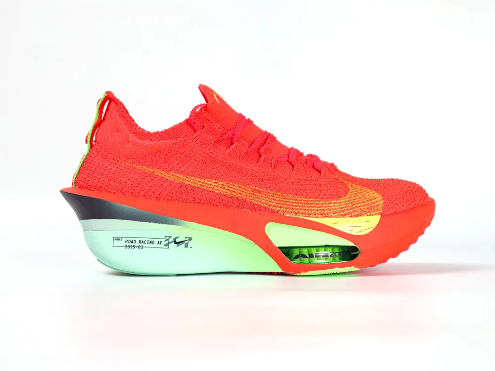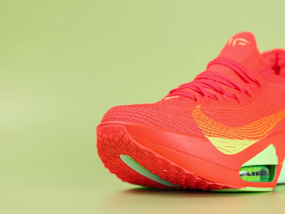 The Nike ZoomX AlphaFly 3 Sneaker in Bright Crimson & Lime Reps Blast features vibrant scarlet and lime green, offering a groundbreaking look that adds dynamism and energy to every stride, designed for runners seeking extreme speed.